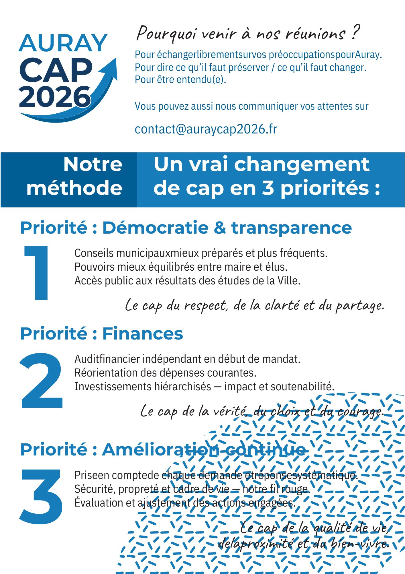 Auray Cap 2026, c’est un projet construit pas à pas, avec vous. Notre ambition : donner à notre ville des perspectives solides et concrètes, tout en respectant nos valeurs de sérieux, d’efficacité et d’humanité.